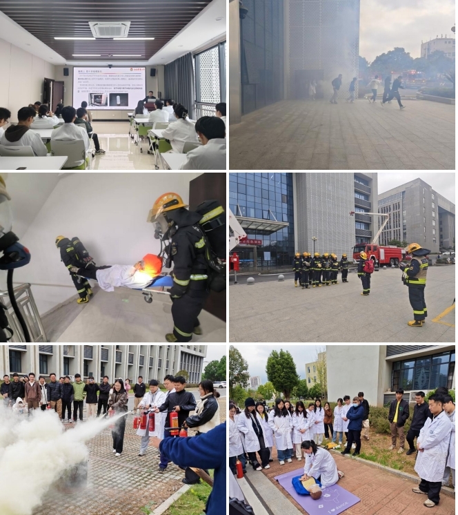 本次演練圍繞“實驗室干燥箱著火”典型隱患,設置“理論講解—場景模擬—實操培訓”全鏈條環節。演練前,資實處工作人員通過剖析真實事故案例,講解隱患誘因;模擬火災場景啟動后,師生在引導下有序疏散撤離;消防救援大隊演示“火情偵察”“模擬營救”流程;校醫院醫護人員開展心肺復蘇急救培訓;保衛處工作人員演示手提式干粉滅火器操作方法并組織學生實操。