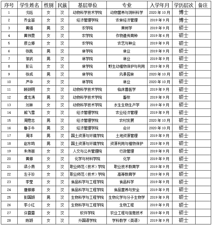 根據(jù)《江西省政府研究生獎學(xué)金管理暫行辦法》(贛財教〔2014〕42號)、《關(guān)于進(jìn)一步做好研究生資助工作的補(bǔ)充通知》(贛助中心〔2015〕39號)等相關(guān)文件精神,我校近期開展了2021年省政府研究生獎學(xué)金評選工作,擬評選推薦碩士26人,博士2人。經(jīng)研究生本人申請,各基層培養(yǎng)單位審核初評,校研究生獎學(xué)金評審領(lǐng)導(dǎo)小組評審,現(xiàn)將我校2021年省政府研究生獎學(xué)金獲得者候選人公示如下(共28人):