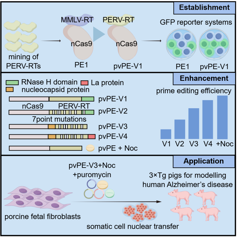 先導編輯(Prime editing, PE)是近年來由基因編輯領域國際知名科學家David Liu團隊率先開發、并獲得迅速發展的新型基因組編輯技術,可以在不引起DNA雙鏈斷裂的情況下實現精準的插入、替換和缺失等多種編輯類型,被譽為“萬能型”基因編輯工具。然而,該技術目前僅在HEK293T等少數細胞系中展示出較高的效率,在豬等大型農業動物中的編輯效率比較低下,成為限制其廣泛應用的重要因素。逆轉錄酶(RT)作為PE系統的核心組分,其活性是影響編輯效率的關鍵。目前主流PE系統采用的逆轉錄酶主要來源于鼠白血病病毒(MMLV),國際上雖有不少課題組嘗試挖掘新的RT用于PE系統,但效率始終未能超越基于工程化的MMLV-RT。因此,開發高活性的全新RT成為推動PE技術突破,尤其是將其應用于家豬等大動物基因編輯的迫切需求。