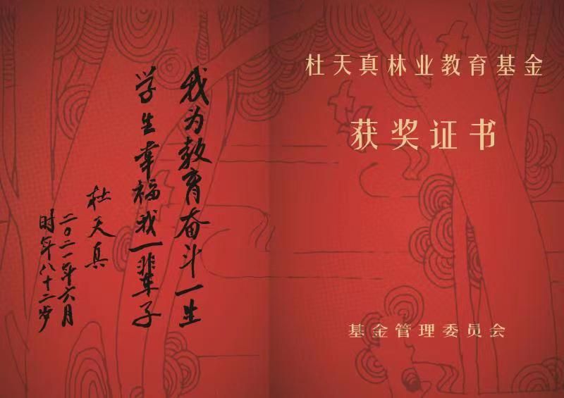 在“杜天真林業教育基金”成立暨頒獎大會上,記者看到,杜老親自參與設計的獎勵證書,樸素簡潔的扉頁上,題寫著杜老鄭重的親筆:“我為教育奮斗一生,學生幸福我一輩子!”