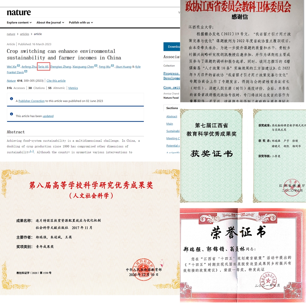 學院緊扣新時代國家戰略需求和學科特色,在鄉村振興、鄉村治理、農戶行為等優勢領域開展研究。2018年來,學院共獲批國家級課題41項,其中國家自科基金25項、國家社科基金5項、教育部人文社科項目8項;省部級課題168項,其中省部級重點及以上項目51項,省部級一般項目117項;獲教育部第八屆高等學校科學研究優秀成果獎(人文社會科學)青年成果獎1項、江西省社會科學優秀成果獎12項和江西省社會科學青年創新團隊1個。2023年度,學院師生共發表中英文論文成果130余篇,其中,TariqAli教授撰寫的研究長文“Crop switching can enhance environmental sustainability and farmer incomes in China”在國際著名學術期刊《Nature》(《自然》)上發表;1項獲政協江西省委員會教科衛體委員會感謝信;6項成果獲得江西省第二十次社科優秀成果獎,其中,一等獎1項,二等獎3項,三等獎2項;出版著作6部;獲批南昌市人文社科研究基地(第二批)2個。江西省鄉村振興戰略研究院獲批江西省重點高端智庫,“江西現代農業及其優勢產業可持續發展決策支持協同創新中心”入選“中國智庫索引(CTTI)來源智庫。