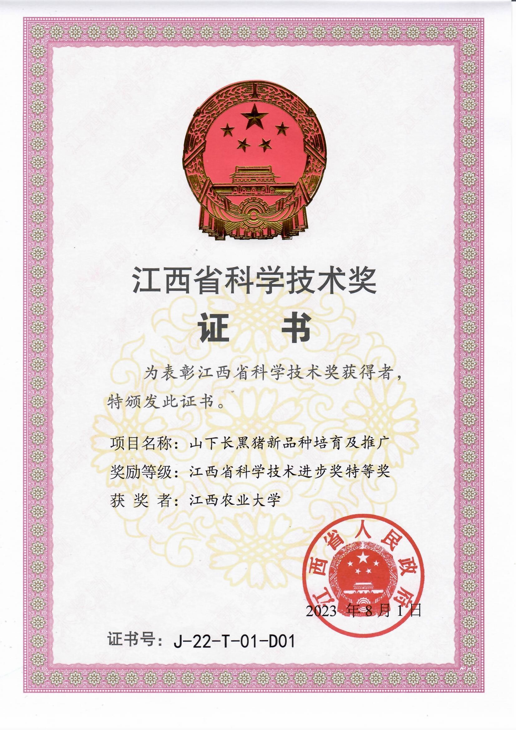 2023年10月,在江西省科學(xué)技術(shù)獎(jiǎng)勵(lì)大會(huì)上,由我校黃路生院士團(tuán)隊(duì)牽頭,聯(lián)合江西山下華系種豬養(yǎng)殖有限公司和南昌師范學(xué)院完成的項(xiàng)目“山下長(zhǎng)黑豬新品種培育及推廣”榮獲江西省科學(xué)技術(shù)進(jìn)步獎(jiǎng)特等獎(jiǎng)。2023年5月,山下長(zhǎng)黑通過(guò)國(guó)家畜禽新品種認(rèn)證,實(shí)現(xiàn)了江西省1999年至今24年來(lái)畜禽國(guó)家審定新品種的新突破,標(biāo)志著我國(guó)在高端種豬資源領(lǐng)域攻破了國(guó)外技術(shù)壁壘,為國(guó)家生豬種業(yè)自立自強(qiáng)、核心種源自主可控作出了重大貢獻(xiàn)。