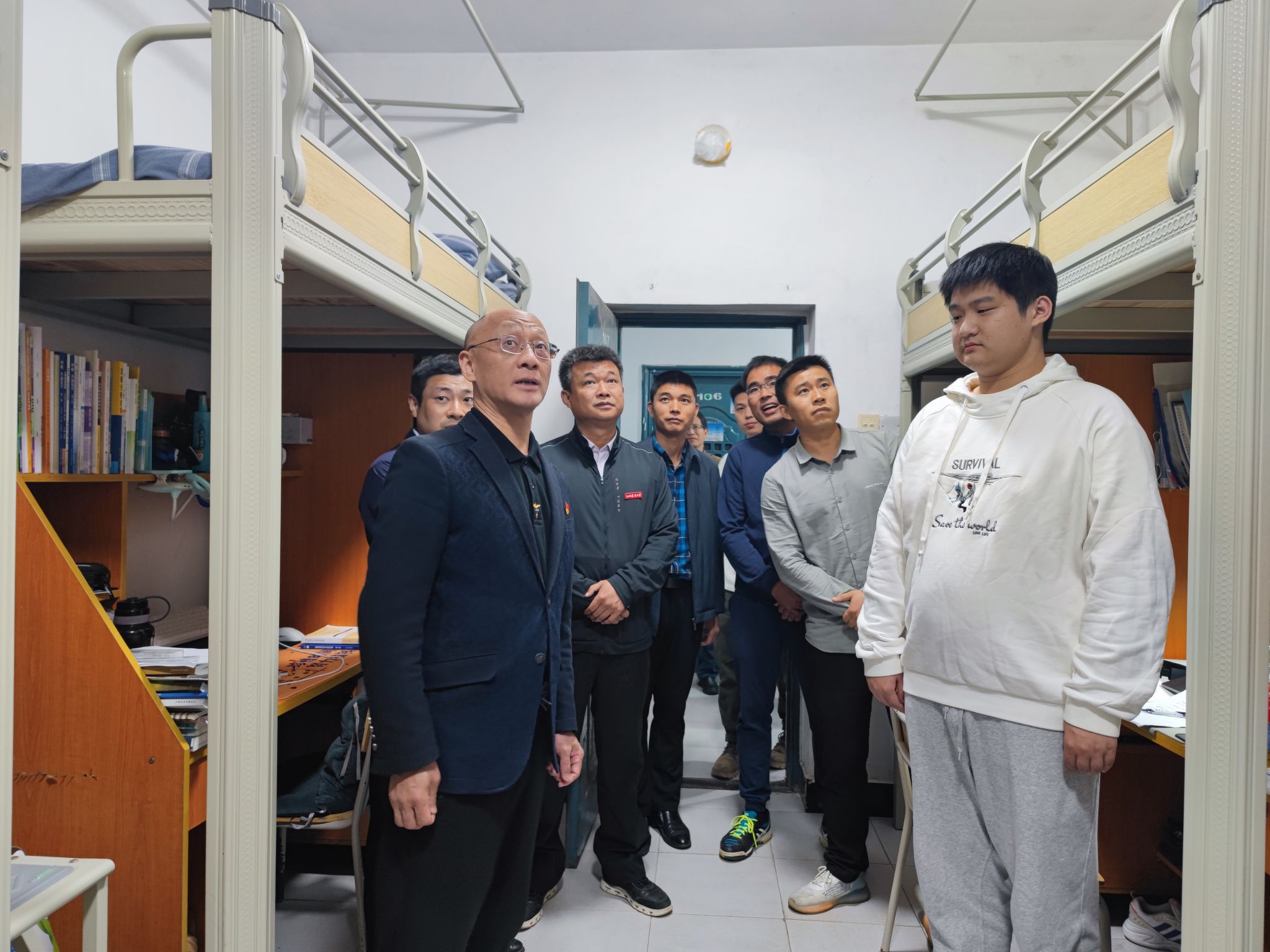 在查看北區學生宿舍環境和基礎設施建設等情況后,黃路生主動詢問同學們學習情況和宿舍熱水使用情況,認真聽取學生對宿舍管理、學校管理的意見建議;著重強調,職能部門要主動下沉開展調查研究,及時整改天花板發黑、洗衣房漏水等問題,為學生營造舒適、安心的生活環境。并勉勵同學們,要爭做愛護宿舍環境衛生、苦練專業本領的模范者,樹立高遠志向,做好學業規劃,珍惜學習時光,不斷錘煉專業本領,提升個人綜合素養。