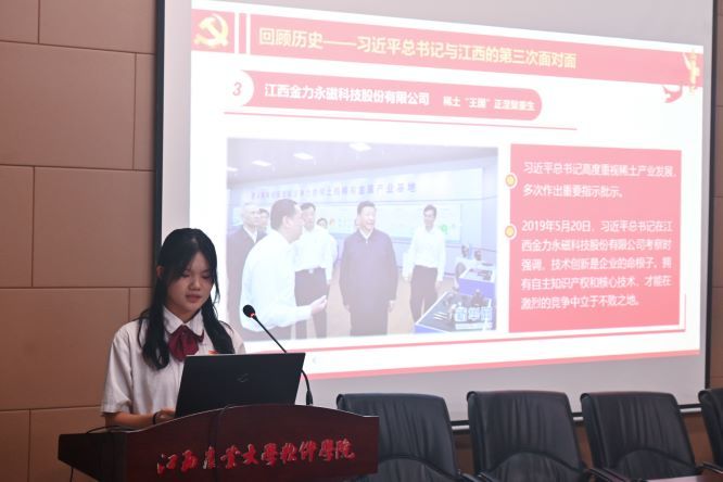宣講團成員雷紫嫣詳細梳理和回顧了黨的十八大以來習近平總書記三次考察江西的重要講話精神。她說:習近平總書記再赴江西考察,充分體現了習近平總書記對我們江西革命老區的一片深情和一以貫之的關心關懷,我們要深刻體會總書記考察江西的重大意義,把感恩之情轉化為奮進之力。