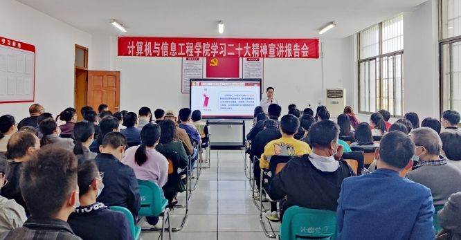 11月1日下午,校黨委副書記蔡海生到計信學院宣講黨的二十大精神,計信學院全體教職工及部分學生黨員、學生代表100余人在現場聆聽,入黨積極分子和大一新生約500人線上參加。