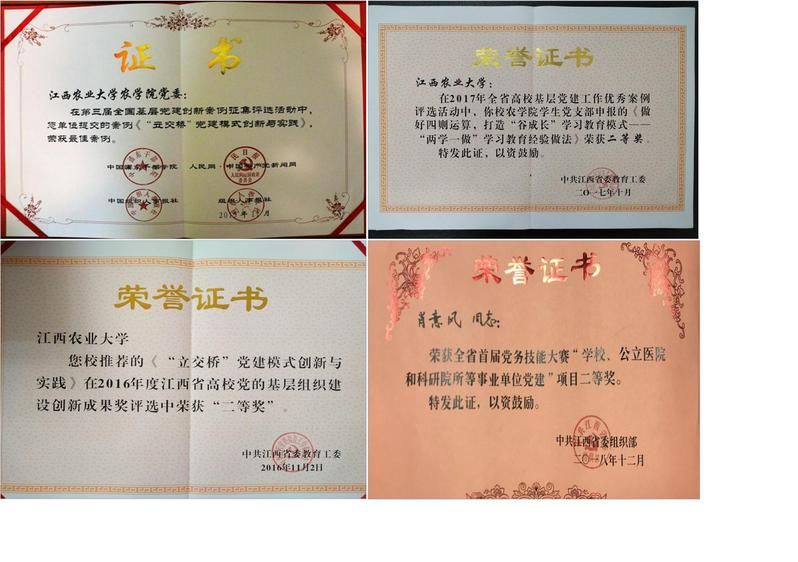 2015年,農(nóng)學院黨委推報的《“立交橋”黨建模式創(chuàng)新與實踐》項目被評為第三屆全國基層黨建創(chuàng)新案例最佳案例,為30個最佳案例中唯一的高校案例,圍繞該黨建項目發(fā)表的論文和立項的課題10余項;2017年,學生黨支部《做好四則運算,打造“谷成長”學習教育模式—江西農(nóng)業(yè)大學農(nóng)學院學生黨支部“兩學一做”學習教育經(jīng)驗做法》獲評全省高?;鶎狱h建工作優(yōu)秀案例。1人榮獲“全省首屆黨務(wù)技能大賽二等獎”。2021年,學院三項勞動教育案例入圍“全省首屆勞動教育成果展”,一項榮獲全省大中幼小勞動教育典型案例一等獎;學院參與申報的“新時代強農(nóng)興農(nóng)‘四三二’實踐育人體系”獲批教育部高校思想政治工作精品項目。
