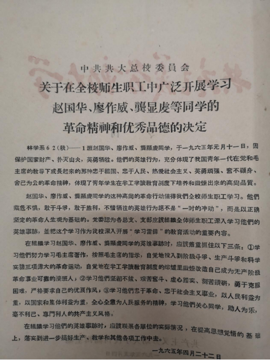 1965年1月11日,共大總校發生了一場“煉山”事故,林學62(秋)1班趙國華、廖作威、龔顯虔等三名學生在救火中犧牲,潘家楨同學重傷。事故發生后,共大總校黨委高度重視,積極善后,搶救傷病學生。同時積極調查事故原因,經調查認定是一起責任事故,對相關責任人進行了嚴肅處理。共大總校黨委于1965年4月向省委、省人委詳細匯報了“煉山”事故及其處理意見,同時總校黨委也作出了深刻檢討,吸取教訓。