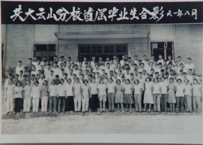 共大云山分校創辦初期,條件非常艱苦,一無所有。面對困難,師生員工發揚自力更生、艱苦奮斗的革命傳統,一面學習,一面勞動,一面勞動建校。沒有校舍,自己動手搭窯燒磚、瓦、石灰,用自己燒制的70多萬口磚建起了3000多平方米磚木結構的教學大樓,在當時是非常了不起的成就。經過幾年的勞動建校,共大云山分校開墾了1700畝荒地,興建了2萬多平方米的校舍,生產了900余萬元的產值,很快做到了自給自足。當年,江西省省長邵式平同志為云山墾殖場和云山分校填了一首《浪淘沙》詞:“云山萬丈高,春煙束腰,襟帶龍鳳千里飄。風景獨數這邊好,物華豐饒。建國要勤勞,集體英豪,同心同德論略韜。意氣風發脫穎出,請看今朝。”贊揚共大云山分校的干部和師生們。