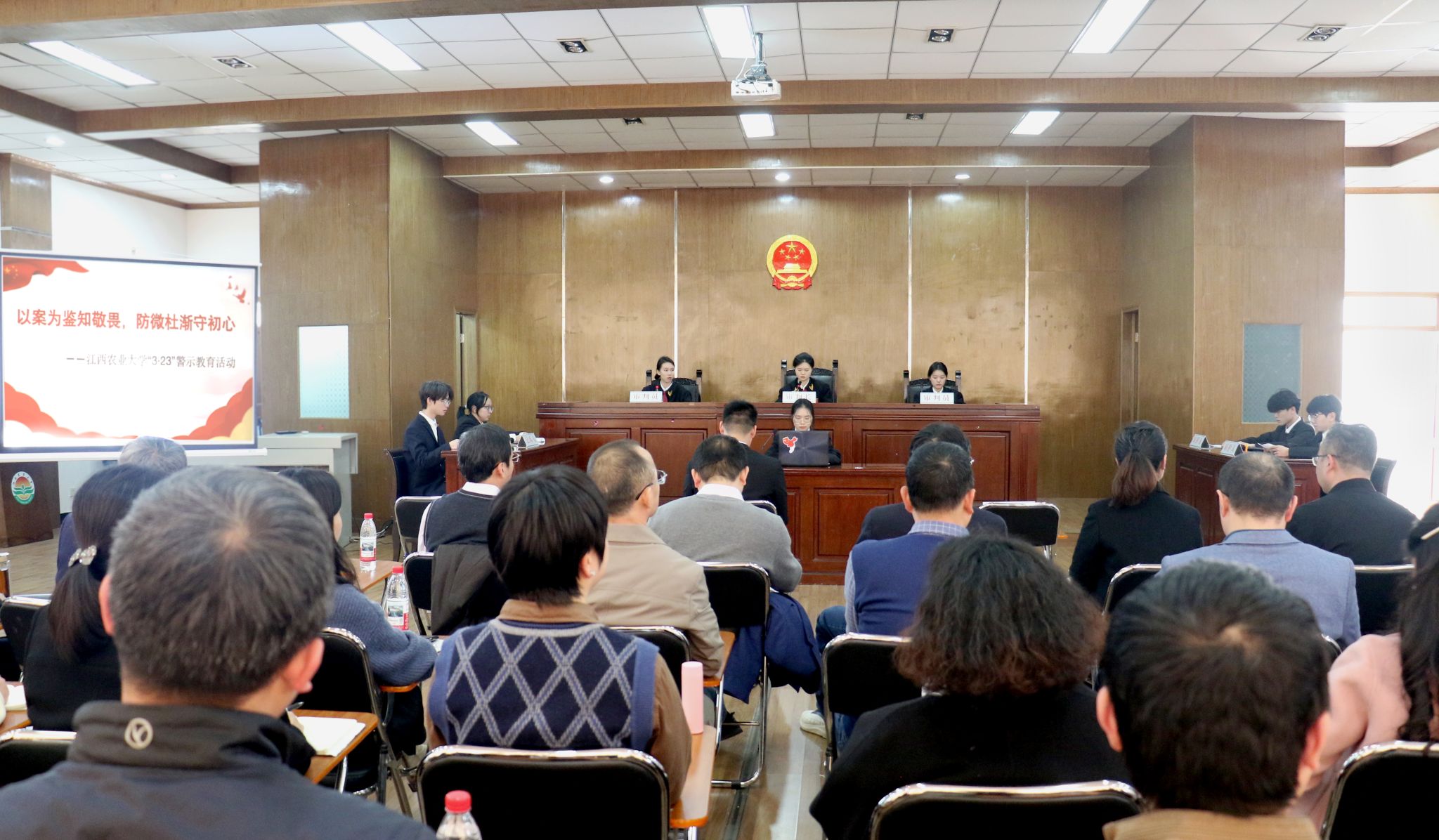 為扎實開展深入貫徹中央八項規定精神學習教育,不斷鞏固深化黨紀學習教育成果,教育引導黨員干部時刻保持“趕考”清醒,履職盡責、擔當作為,3月21日,學校組織開展旁聽模擬法庭警示教育活動。省紀委省監委駐校紀檢監察組組長、校黨委委員、紀委書記劉斯龍出席活動,駐校紀檢監察組、人文與公共管理學院相關負責人和各單位分管財務工作負責人70余人到場觀摩。