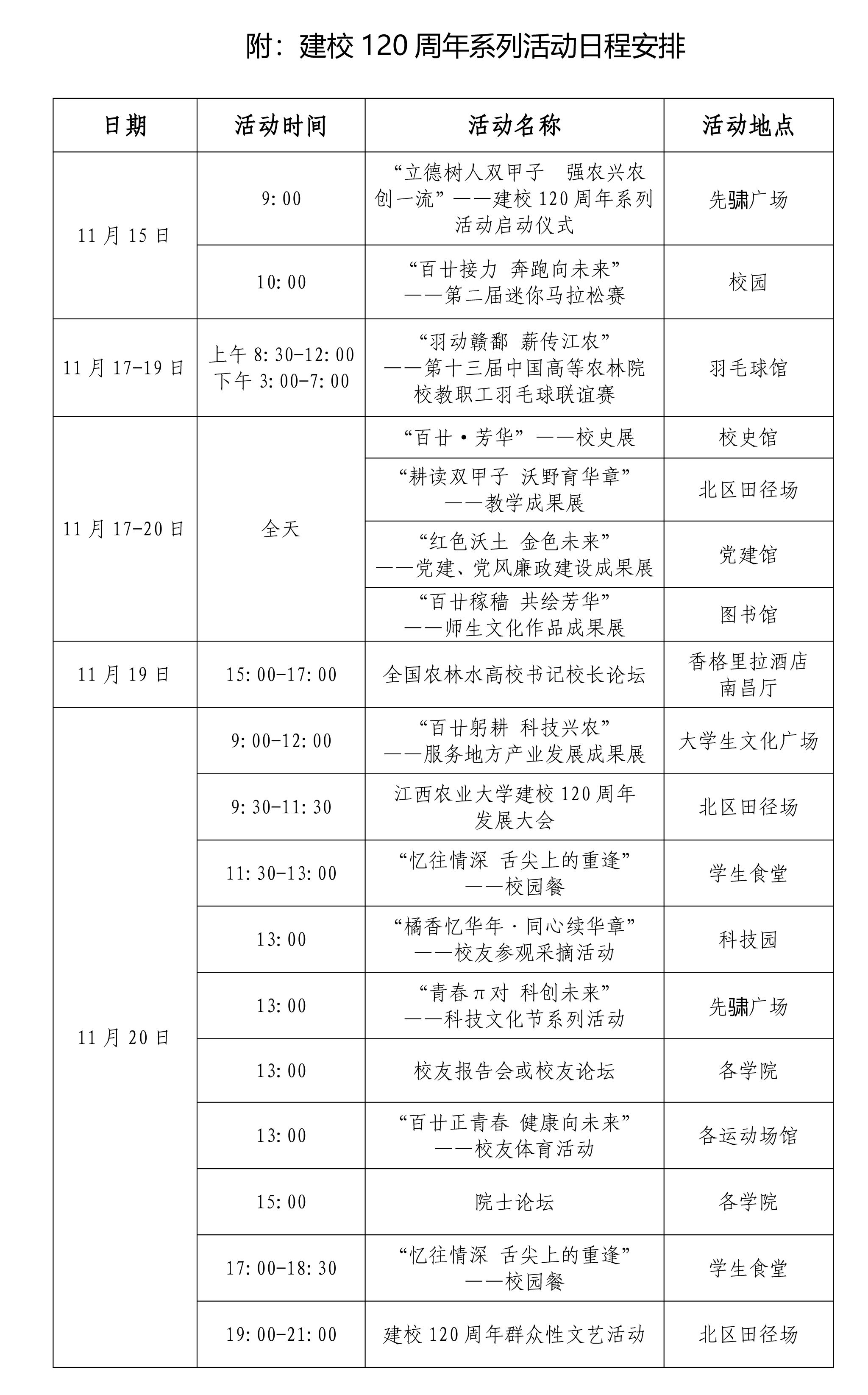 凝心聚力共賀華誕,奮發有為再續新篇!為進一步總結學校百廿載辦學經驗特色、弘揚精神文化傳統,更好匯集發展智慧、凝聚各界力量,努力建設“華東地區有重要影響、綜合實力居省內前列、特色學科創國內一流”的有特色高水平大學,學校將于11月20日上午舉辦建校120周年發展大會,并在11月15日至20日期間,舉行系列主題活動,誠邀廣大校友、各界賓朋相聚江農、共襄盛舉!