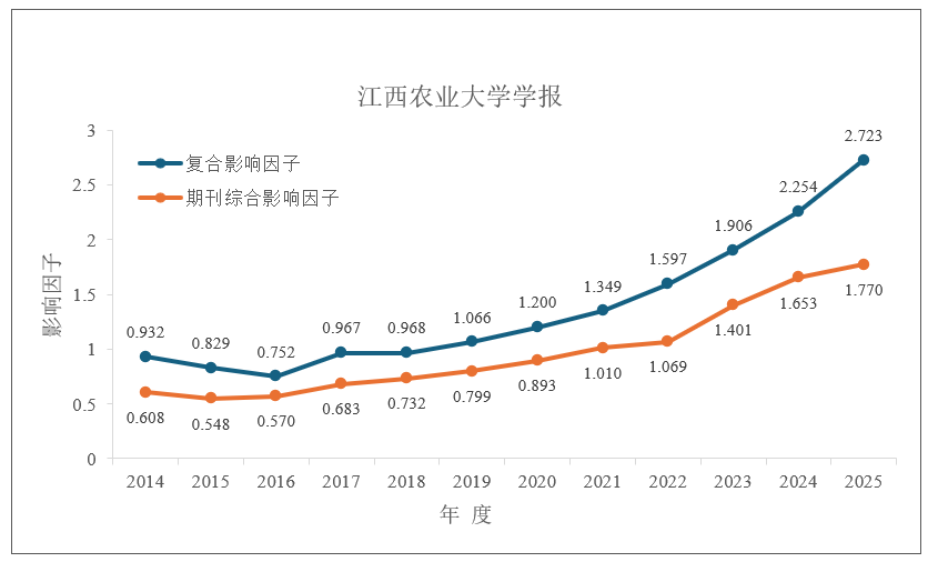 近日,《中國學術期刊(光盤版)》電子雜志社有限公司與中國科學文獻計量評價研究中心聯合發布了《中國學術期刊影響因子年報》(2025版)。我校《江西農業大學學報》《農林經濟管理學報》《生物災害科學》三刊多項核心指標再創新高。
