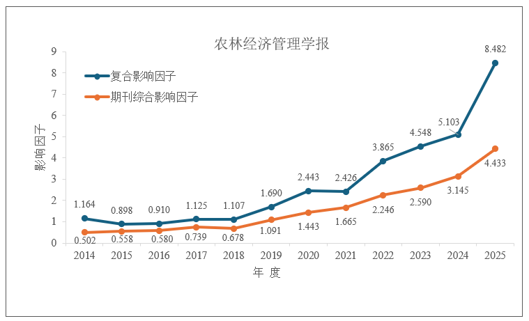 其中,《江西農業大學學報》2025年復合影響因子為2.723,較2024年提高20.81%,在全國117種農業綜合類學術期刊中“影響因子學科排序”為第15位,位于Q1區;《農林經濟管理學報》2025年復合影響因子為8.482,較2024年提高66.22%,在全國60種農業經濟類學術期刊中“影響因子學科排序”為第9位,位于Q1區;《生物災害科學》2025年復合影響因子為1.018,較2024年提高35.73%,影響因子首次突破1.0。這系列數據的提高,彰顯出我校三刊在學術質量、行業認可度、傳播力等方面持續進階。