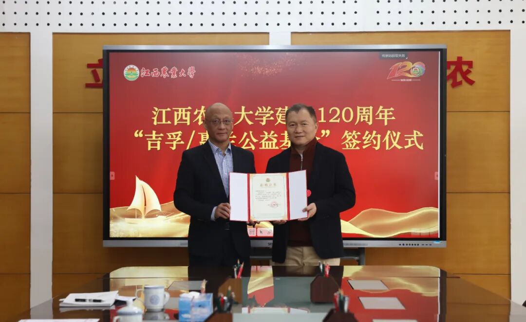 11月17日下午,江西農業大學教育基金會“吉孚/惠蘭項目”捐贈簽約儀式在校行政樓舉行,捐贈人周逵先生出席儀式,并向學校捐贈人民幣900萬元。校黨委書記黃路生院士,副校長張高亮,學校財務處、校友服務中心、軍體部負責人參加儀式。副校長王文君主持。